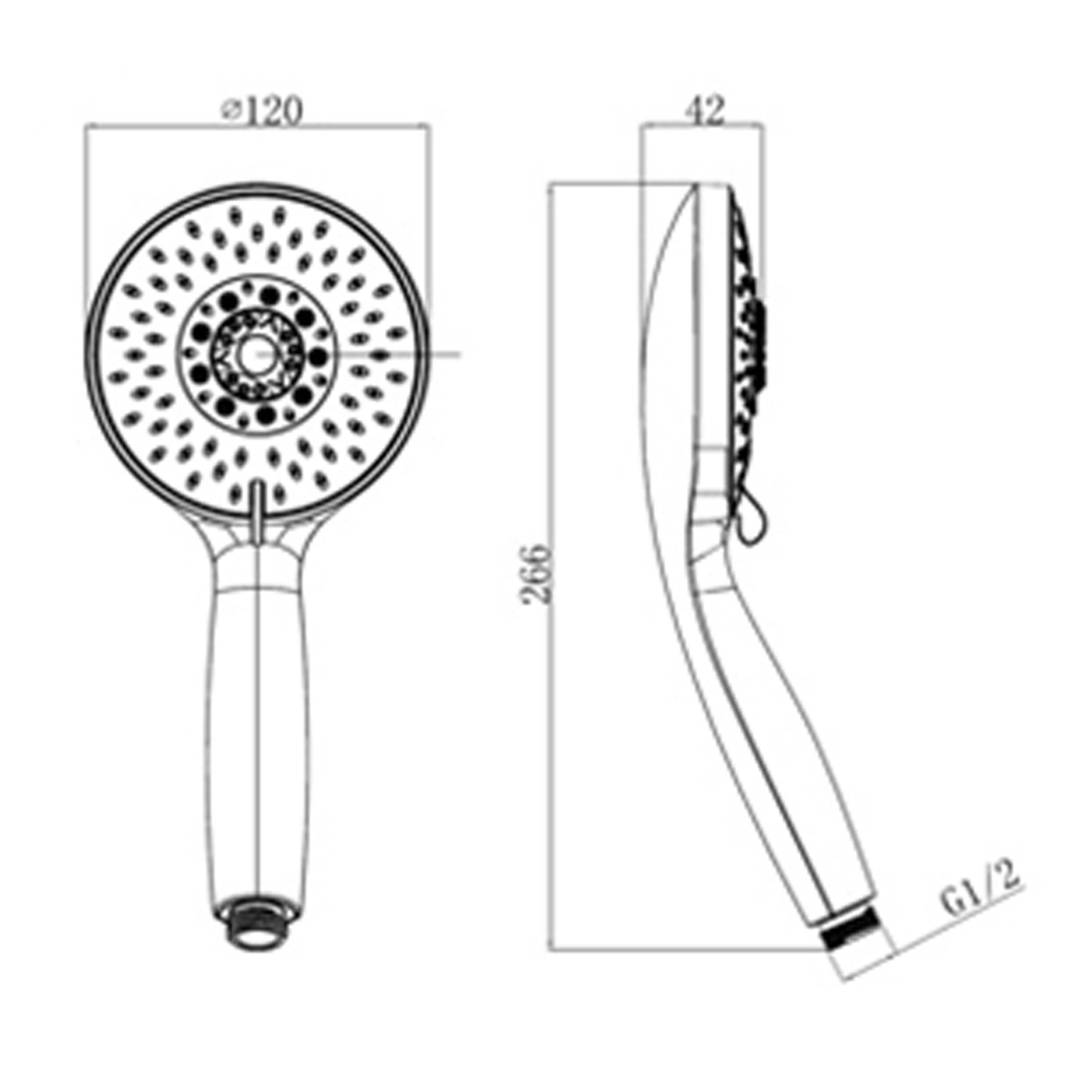 Ручной душ. 5 режимов. Диаметр - 120 мм. Поток 12,5 л/мин. Гипоаллергенный ABS пластик. Форсунки из силикона с функцией самоочистки Эргономичный изгиб головки лейки подходит для людей с артритом.